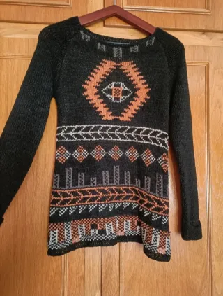 Jersey con un dibujo étnico muy llamativo. Es unaprenda cómoda y con estilo. Diseño de rombos en blanco y negro.Flecos en el bajo.Cuello redondo. Talla/ U Medidas 55 cm de axila a axila