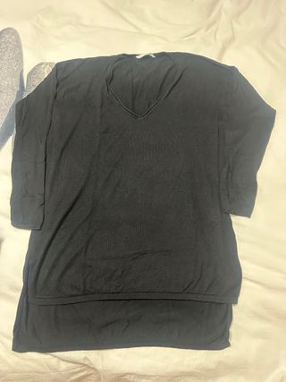 Jersey de la marca Pull & Bear en color negro clásico con cuello de pico (V). Está confeccionado en un tejido de punto fino muy agradable (65% algodón y 35% nailon), lo que lo hace cómodo y resistente a los lavados. El estado es impecable, muy poco uso y sin desperfectos. Medidas aproximadas tomadas en plano: • Sisa a sisa: 55 cm • Largo total: 66 cm • Largo manga: 69 cm • Ancho de hombros: 42 cm