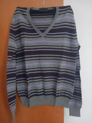 Jersey de manga larga con cuello en pico y estampado de rayas horizontales. Ver medidas mejor en foto. Solo venta por envio excepto si hemos tenido contactos satisfactorios podemos quedar. - Diseño de rayas en gris, morado y negro. - Cuello en pico.