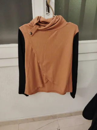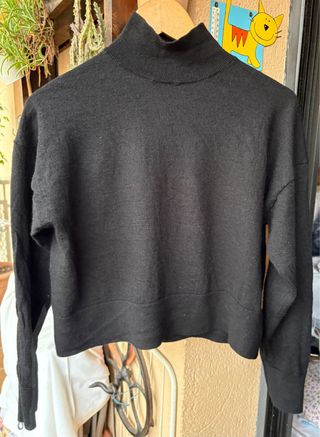 Jersey fino de punto con cuello alto. No tiene etiqueta y no estoy segura de si es talla S o M ni de la marca. Mide 29 cm entre axilas y 55 de hombro hasta abajo. - Tejido acanalado. - Manga larga. - Diseño ajustado.