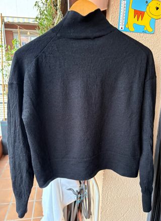 Jersey de punto grueso en color negro. Presenta un diseño moderno con cuello alto y cierre de hebilla. - Cuello alto con detalle de hebilla. - Cierre de botón en la solapa, está descosido ( última foto ) - Tejido de punto acanalado.