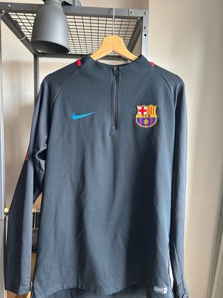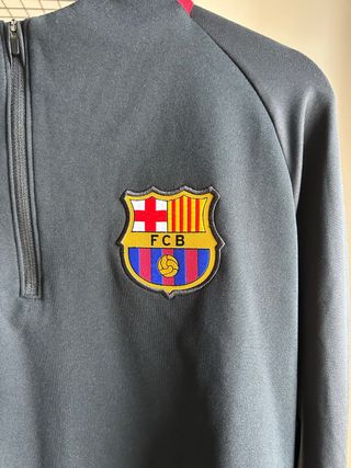 Camiseta deportiva del FC Barcelona. - Diseño en color negro con detalles en rojo. - Logo de Nike y escudo del club. - Media cremallera en el cuello. - Sin publicidad.