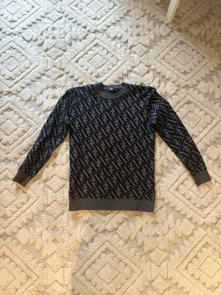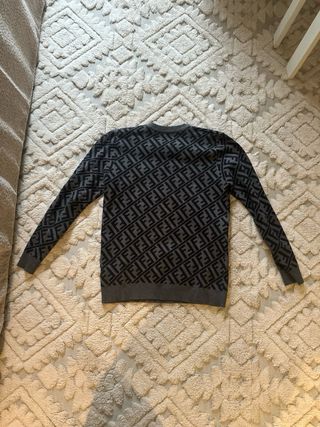 Jersey de punto con el icónico monograma de Fendi. - Diseño de cuello redondo pero no es alto. - Patrón FF en blanco sobre fondo negro. - Ribetes a rayas en el cuello, bajo y mangas - Tallaje pequeño, es mas similar a una 38 que a una 40