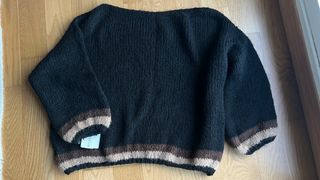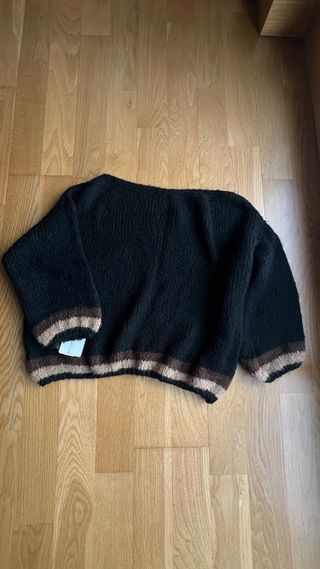 • Jersey amplio de punto • Color negro • Puños y bajo con diseño de rayas marrones y beige • Cuello barco • Nuevo, con etiqueta • Talla única • Es de Bambola Presenta detalles en los puños y en el bajo
