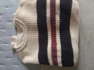 Jersey de punto con un diseño de rayas en varios colores. Es una prenda cómoda y versátil. Tiene algún enganchón en las mangas pero en buen estado - Diseño de rayas en beige, negro y burdeos. - Cuello redondo. - Tejido de punto texturizado.