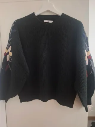 Jersey de punto grueso en color negro. Presenta un diseño de bordado floral en las mangas. - Mangas con detalle bordado. - Cuello redondo. - Corte holgado.
