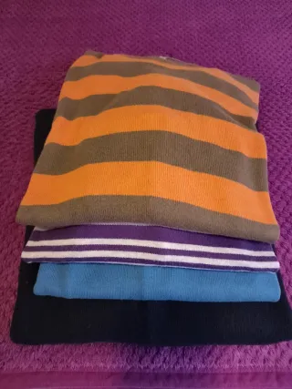 Conjunto de cuatro jerséis para hombre con diferentes diseños y colores.Al comprar los 4 regalo uno.m - Jersey de rayas naranjas y grises. - Jersey de rayas moradas y blancas. - Jersey azul. - Jersey negro.