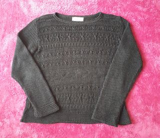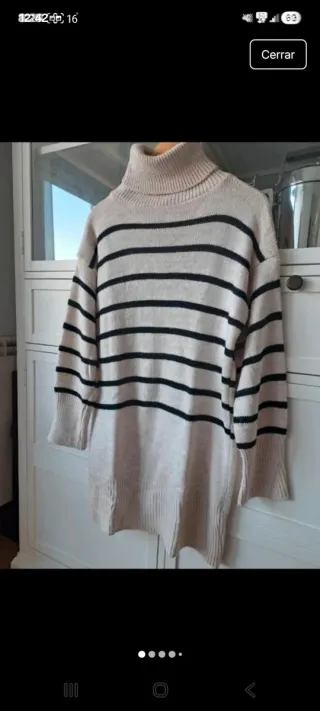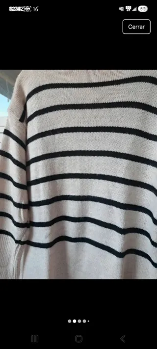 Precioso jersey de punto grueso trenzado, en color blanco-crudo y rayas anchas horizontales en color negro. Ancho y cómodo. 52% acrílico y 48% algodón. Poco uso , en perfecto estado. T-M de Zara (medidas en últimas fotos).