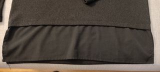 Jersey negro largo (70cm aproximadamente) con cuello y parte de abajo del jersey de camisa blanca incorporada. La parte principal de la prenda — el cuerpo y las mangas — está hecha con tejido de punto. Es elástico y suave. Abriga muy bien. Una sola prenda con efecto de “llevo camisa debajo”. • Da un look más arreglado sin la incomodidad de llevar dos capas. • No abulta y es más cómodo de llevar. Composición: • Jersey: - 66% Acrílico - 34% Poliéster • Camisa: - 60% Algodón - 40% Poliéster