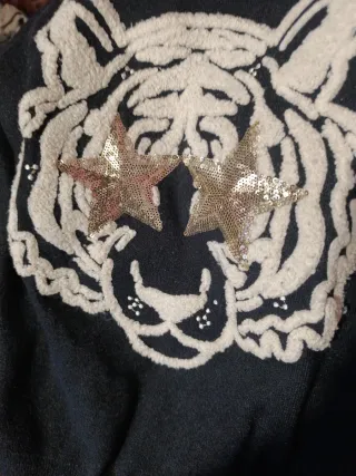 Jersey negro con un diseño de gato en relieve y lentejuelas. Muy poco uso. Me gustan más largos por debajo pero es cómodo. - Detalle de gato con relieve. - Adornado con lentejuelas. - Manga larga.