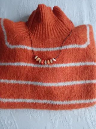 Jersey de punto con cuello alto y rayas. - Diseño de rayas horizontales. - Cuello alto acanalado. - Tejido suave esponjoso y cálido. - Collar sin estrenar en tonos naranjas y oro con fino cordón negro .Se entrega con su bolsa regalo