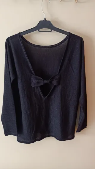 Jersey fino de tacto suave con un toque brillante. Presenta un diseño original en la espalda con un lazo decorativo y una abertura. - Tejido ligero y con brillo. - Detalle de lazo en la espalda. - Escote en pico.