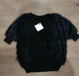 Bonito jersey negro con textura de pelo. Es una prenda suave y llamativa. - Diseño con pelo largo. - Manga corta. - Cuello redondo.