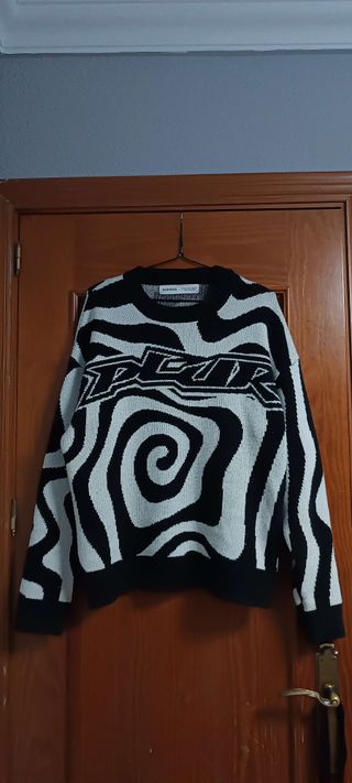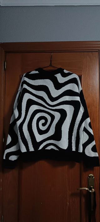 Estado: 8/10 ✅ Muy buen estado, apenas usado. Jersey de punto en blanco y negro con diseño espiral y estilo streetwear / urbano. Tejido grueso y llamativo, queda muy bien puesto. Talla: S Marca: Bershka Material: 90% Acrílico 10% Poliamida Medidas en las fotos 📏 Envío 24/48h 🚀 No lo uso y por eso lo vendo. Cualquier duda, escríbeme sin problema 😊