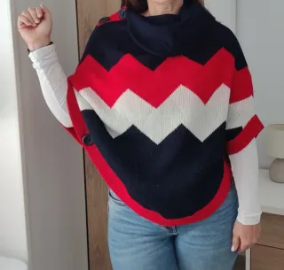 🎀 Capa / poncho / jersey con botones laterales en la parte baja que, al cerrarse, crean el efecto de mangas, permitiendo llevarlo como un jersey oversize o como una capa abierta. Cuello alto estilo chimenea con detalle de botones en los hombros. Punto grueso con ondas zig-zag y combinación clásica en azul marino (casi negro), rojo vibrante y blanco. Tiene un 30% de lana merino en su composición. De la prestigiosa marca Altona dock talla S. #poncho #capa #punto #knitwear #tallas #altonadock #oversize #boho #colorblock #invierno #merino #lanamerino #jersey #chevron #zigzag #talla36 #preppy #winterwear #casual