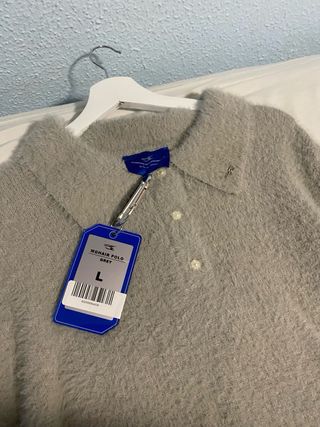 Jersey tipo polo de la marca Noemotions en color gris. Confeccionado en un suave tejido de pelo de nailon Color gris, con detalles negros y perlasblancas, además de detalles metálicos Regular fit. Talla L. Muy cómodo y caliente Respondo cualquier duda👍🏻