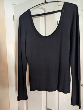 Jersey básico de manga larga con cuello en pico y detalle ondulado. Poco uso. - Tejido de canalé. - Puños y bajo con acabado festoneado.