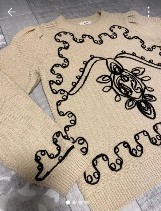 Jersey de punto en color beige con un llamativo bordado negro. - Diseño con cuello redondo. - Mangas largas abullonadas. - Detalle de bordado ornamental en el pecho y puños.