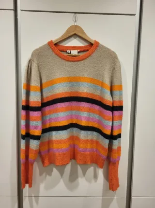 Jersey de mujer con un diseño de rayas vibrantes y un tacto suave. - Cuello redondo. - Manga larga. - Puños y bajo de canalé. Es muy bonito para cualquier vaquero o pantalón negro. Está en muy buen estado