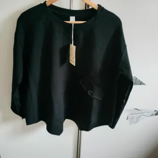 Jersey negro punto corto, para chica corto. T. M es bastante justo. Tiene el.borde del cuello con bisutería de perlitas. Muy actual