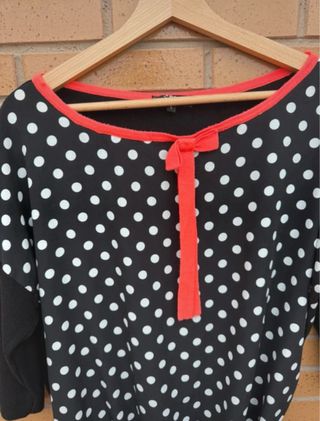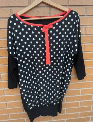 Jersey de Morgan con estampado de lunares blancos sobre fondo negro. Presenta un detalle de lazo y ribete en color coral. - Manga larga. - Cuello redondo. - Bajo con acabado festoneado.