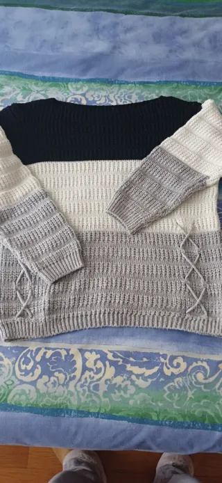 Jersey oversize con un diseño de rayas horizontales. - La talla puede ir de 38-46 - Cuello en pico. - Manga larga. - Tejido suave.