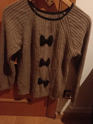 Jersey de punto con un diseño original. - Color marrón con detalles brillantes. - Tres lazos negros decorativos en la parte frontal. - Cuello redondo con ribete negro.