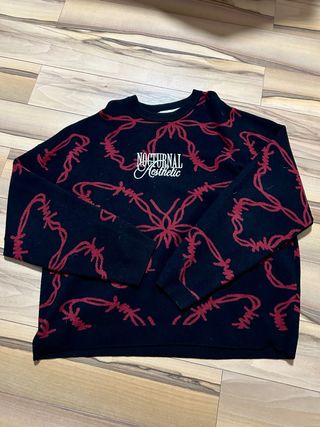 Jersey de Bershka con un diseño llamativo de alambre de espino en rojo sobre fondo negro. Es una prenda sin usar. - Diseño de alambre de espino. - Combinación de colores negro y rojo. - Sin etiquetas.