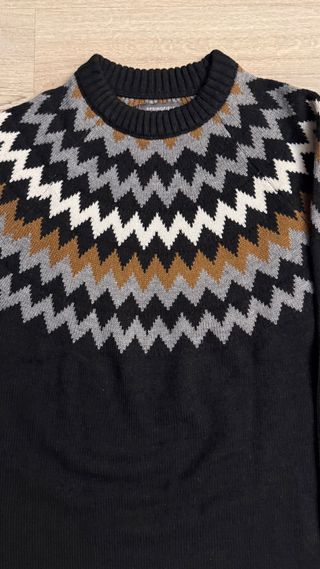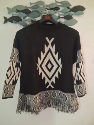 Jersey de punto con un diseño llamativo y moderno. Usado 2 veces. - Diseño de rombos en el frente y mangas. - Borde inferior con flecos.