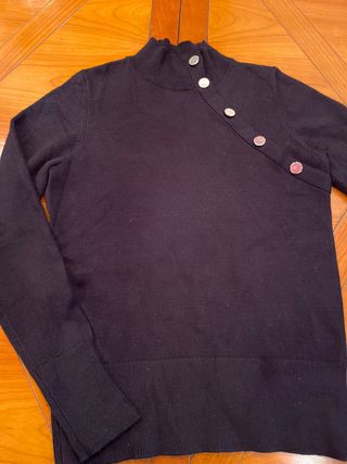 Jersey de punto con un diseño elegante y moderno. - Cuello alto con detalle fruncido. - Cierre asimétrico con botones decorativos. - Manga larga. - Bajo y puños acanalados.
