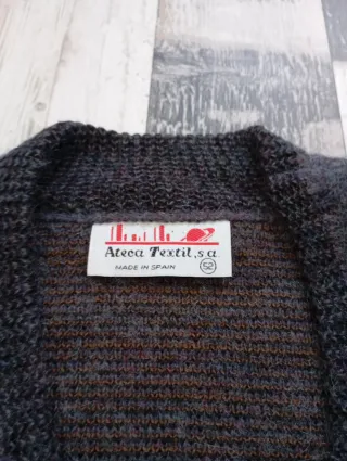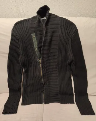 Jersey de punto negro con un diseño de trenzas y cremallera. Sube y tb baja pero ld fata el agarrador - Cuello alto. - Cremallera frontal. Pero le fata el agarrador de adorno - Diseño de trenzas en el tejido.