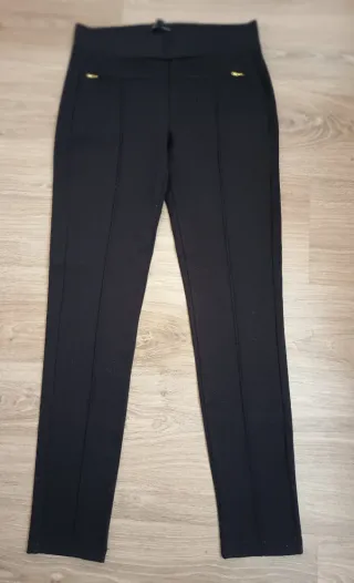 Pantalón negro de la marca Chocolate, talla M. Un básico imprescindible en color negro liso, muy elegante y con un diseño que estiliza al máximo. Estado: Muy buen estado. Color: Negro intenso uniforme (todo del mismo tejido). Corte: Diseño tipo pitillo con una costura vertical frontal (raya marcada) que alarga visualmente la pierna. Detalles: Cintura elástica ancha para un ajuste perfecto y muy cómodo. Incluye dos cremalleras doradas decorativas en la parte delantera que le dan un toque de calidad. Versatilidad: Ideal para un look de oficina con blazer o algo más casual con jersey. El tejido tiene cuerpo, es elástico.