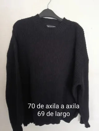 Jersey de punto negro con un diseño de canalé. Es una prenda cómoda y versátil. No se ha usado, tiene alguna motita de estar guardado con otros jerseys pero no tiene ni bolas. Está bien y es bastante ancho, es XL pero da bastante más. Las medidas están en las fotos y aquí abajo - Medida axila a axila: 70 cm. - Medida de largo: 69 cm.