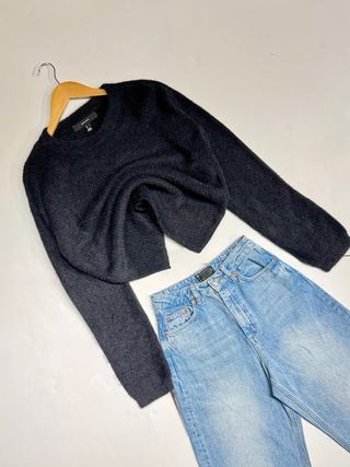 Jersey de punto suave en color negro. - Diseño cropped. - Manga larga. - Cuello redondo.