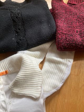 Conjunto de tres jerséis cálidos, perfectos para el frío. - Jersey negro con detalles brillantes. - Jersey granate con textura y destellos. - Jersey blanco con cuello de canalé. Mangas acampanadas en canale desde el codo. Llenos de detalles.