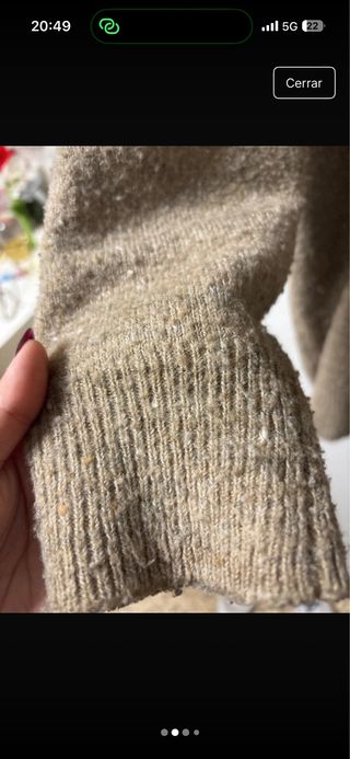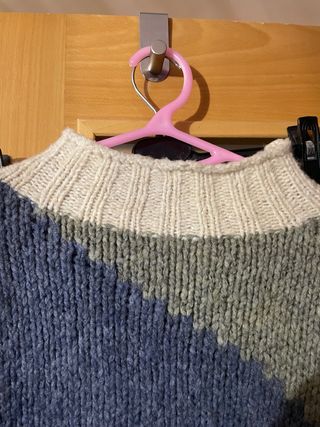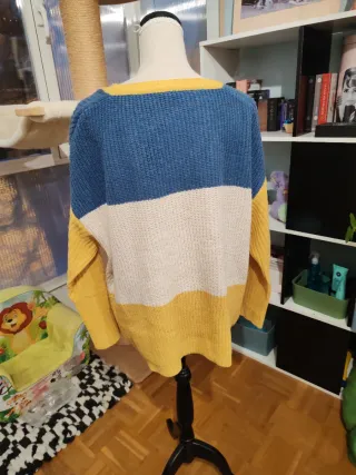 Jersey con un diseño bicolor y actual, cortito.Suave, talla M, estilo oversize, no tiene ninguna etiqueta ni marca. Lo compré hace poco, pero se me engancha, y tiene algún enganchón se puede arreglar con aguja de lana