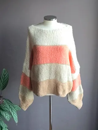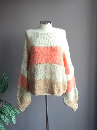 Jersey oversize con un diseño de rayas horizontales. - La talla puede ir de 38-46 - Cuello en pico. - Manga larga. - Tejido suave.