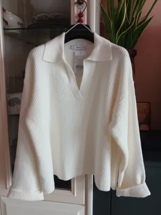 Jersey tipo crop top, de punto grueso Marca: Pimkie Talla: S. Es oversize. Color blanco, más bien marfil. Composición: 75% algodón, 25% poliéster. Estado: algo usado, en perfectas condiciones Precio: 8€