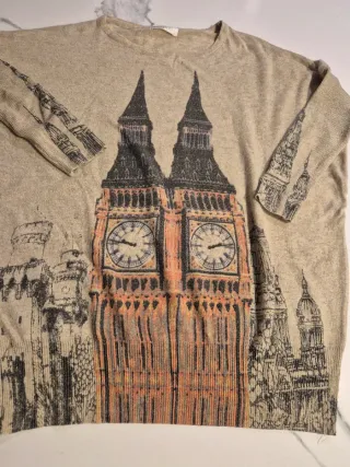 Jersey de la marca Purplish London, comprado en Londres. Tiene un diseño muy original con Big Ben y varios monumentos de Londres en la parte frontal y las mangas, lo que lo convierte en una prenda muy especial. • Marca: Purplish London • Talla: L (queda oversize) • Diseño: Big Ben y skyline de Londres • Estado: Muy buen estado, apenas usado • Muy cómodo y fácil de combinar Ideal para estilo casual, urbano o streetwear. Prenda poco común en España al haber sido comprada en Londres.