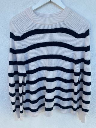Jersey de punto con rayas marineras. Es un modelo oversize, por lo que puede valer para una talla M. - Diseño de rayas horizontales. - Manga acampanada. - Aberturas laterales.