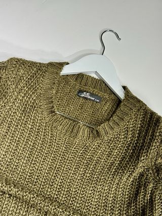Jersey de estilo oversize con un diseño moderno y llamativo. - Tejido de punto trenzado. - Cuello en V con ribetes. - Detalles de rayas en puños y bajo. - Logo LS en el pecho. La marca de la tienda no me deja ponerlo pero en la etiqueta se ve de donde es