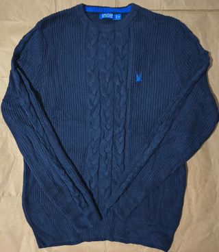 Jersey de punto en color azul oscuro. Presenta parches en los hombros y en las mangas. - Cuello redondo. - Puños y bajo acanalados.
