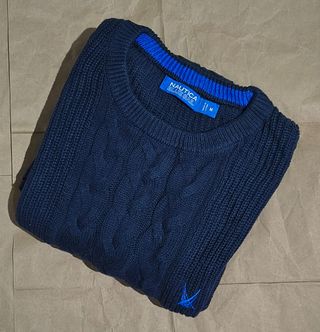 Jersey de punto azul con diseño trenzado y cuello redondo. Un clásico de la marca Náutica. - Tejido de punto con textura. - Detalle de trenzas en los laterales. - Cuello redondo acanalado. - Pequeño logo bordado en la parte inferior.