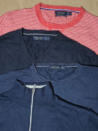 Conjunto de cuatro jerséis de la marca Nautica. - Jersey a rayas rojas y blancas con cuello redondo. - Jersey azul marino con cuello redondo y detalle de raya blanca. - Jersey azul marino con cremallera y cuello alto. - Jersey negro con cuello en V.