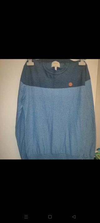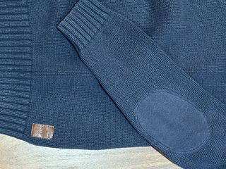 Vendo jersey azul de punto abotonado en el cuello de Springfield. En las mangas tiene coderas en tonalidad más oscura que contrastan con el azul del jersey.