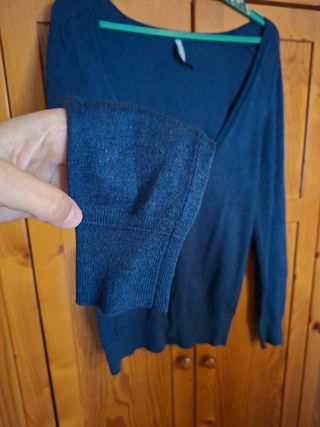 Jerséi azul tejido, un poco más largo por detrás que por la parte delantera, con cortes en los laterales. Está usado, tiene algunas pelotillas en la parte de delante, causadas por el uso. Ver foto. Es talla única, pero queda como una M-L