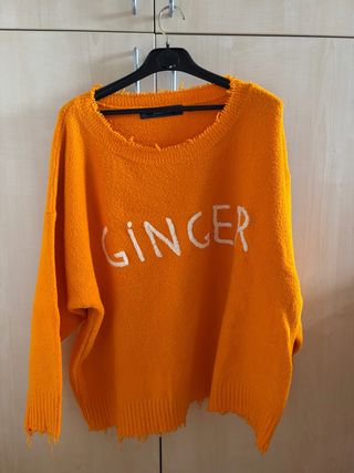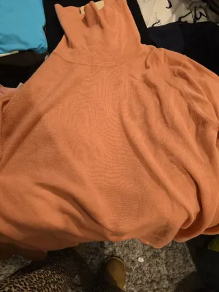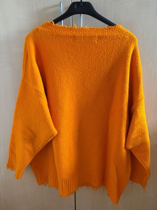 Jersey grueso en color naranja vibrante, con un diseño moderno y detalles desgastados en cuello, puños y bajo. Mide pecho 63 cm. Hombros 60 cm. Largo 60 cm. Acrílico, lana... - Cuello redondo. - Manga larga. - Corte holgado.