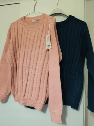 Conjunto de dos jerséis de punto con diseño trenzado. Uno en color rosa palo y otro en azul marino. Tallas ML y XL-XXL - Diseño de punto trenzado. - Cuello redondo. - Manga larga.