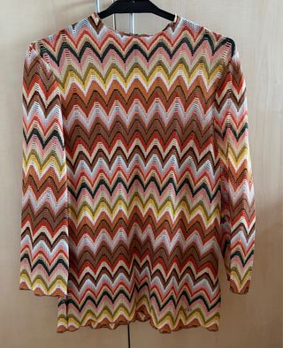 Jersey de punto con un llamativo diseño de zigzag. Mide pecho 45 cm. Hombros 40 cm. Largo 67 cm. - Diseño de zigzag. - Manga larga. - Cuello redondo.