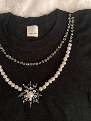 Jersey de punto fino en color negro, con un diseño elegante. - Detalle de dos collares de pedrería y perlas. - Un colgante central con forma de estrella adornado con cristales y una perla grande. Lana y cachemira.